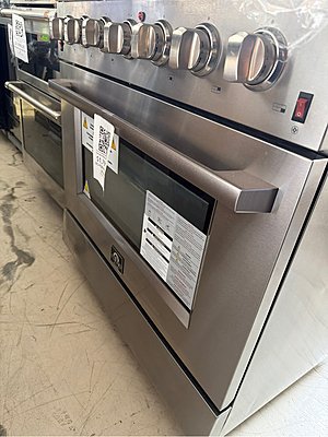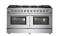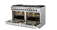 Grade B The Forno Galiano FFSGS6244-60 is a professional-grade 60-inch freestanding gas range designed for high performance and modern kitchens. It features ten Italian DEFENDI sealed brass burners with a total output of 142,000 BTUs, providing precision control from simmering to searing. Dual electric convection ovens (4.32 cu. ft. each) offer a total capacity of 8.64 cu. ft., ideal for cooking multiple dishes simultaneously. Each oven includes convection fans, blue enamel interiors, and two halogen lights for clear visibility. Constructed from premium 304-grade stainless steel, this range offers durability, corrosion resistance, and a sleek professional look. Comes with heavy-duty cast iron grates, soft-close doors, pro-style knobs, and a digital temperature display on the backguard. Includes LP conversion kit, two oven racks per oven, and a reversible griddle plate. Electrical requirements: 120V / 15A, compatible with Natural Gas or LP. Dimensions: 59.8” W × 37.4” H × 28” D. ⚠️ Condition Note: The unit is fully functional — all burners and ovens operate perfectly. There are minor cosmetic dents on the exterior, which do not affect performance or usability. https://therangehoodstore.com/products/forno-galiano-60-gas-range-stainless-steel-ffsgs6244-60
