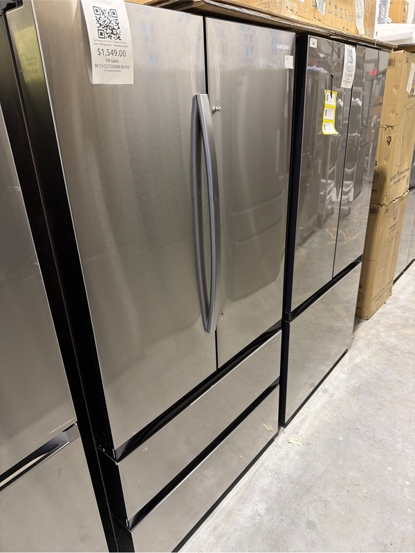 GRADE A The Samsung RF31CG7200SR is a 31 cu. ft. standard-depth 3-door French door refrigerator designed for large-capacity storage and modern kitchen functionality. This model features a wide French door layout with a spacious bottom freezer drawer, providing easy access and efficient organization. It is equipped with an external ice and water dispenser for convenient access to filtered water and ice. Advanced cooling technology helps maintain consistent temperatures throughout the refrigerator to keep food fresh longer. Adjustable glass shelves, large door bins, and humidity-controlled crisper drawers allow flexible storage for a variety of food items. Bright LED interior lighting provides clear visibility across all compartments. The fingerprint-resistant stainless steel finish helps reduce smudges and makes cleaning easier. Designed for reliable daily use, this refrigerator combines high capacity with efficient performance. Condition note: The unit is fully functional and working properly. Minor cosmetic dents and light scratches may be present and do not affect operation. https://www.homedepot.com/p/Samsung-31-cu-ft-Mega-Capacity-Standard-Depth-4-Door-French-Door-Refrigerator-in-Stainless-Steel-with-Dual-Auto-Ice-Maker-RF31CG7200SR/326195029#overlay