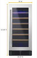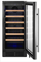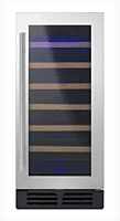 grade b The Whirlpool WUW35X15DS is a 15-inch built-in undercounter wine center designed to store and preserve wine at optimal serving temperatures. This model features a temperature-controlled single zone, allowing consistent cooling for wine storage. The stainless steel door with glass window provides a clean, modern appearance while protecting bottles. It includes smooth-glide wire racks, interior LED lighting, electronic touch controls, and adjustable temperature settings. The compact 15-inch width makes it ideal for kitchen islands, bar areas, or entertainment spaces. Designed for built-in installation under standard countertops. Minor dents and scratches may be present. Unit is fully functional.