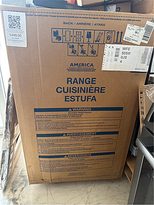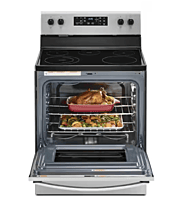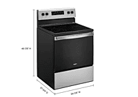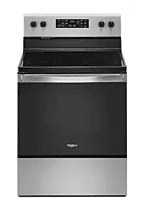 Grade A The Whirlpool WFE505W0JS is a 30-inch freestanding electric range with a 5.3 cu. ft. oven capacity, ideal for family cooking. Equipped with five radiant elements, including a dual 9”/6” FlexHeat™ element that accommodates different pan sizes. The Frozen Bake™ Technology allows you to skip preheating for frozen meals like pizzas and lasagnas, saving time and energy. The ceramic glass cooktop is easy to clean and resists stains and scratches. Features a high-powered 3,000W burner for rapid boiling and a warming zone to keep dishes ready to serve. The spacious oven features Fan Convection for even baking and roasting. Includes Adjustable Self-Cleaning cycles, electronic touch controls, large oven window, and interior light. Finish: Fingerprint-Resistant Stainless Steel Fuel type: Electric Electrical: 240V / 60Hz / 40A Dimensions: 29.9” W × 47.9” H × 27.9” D https://www.homedepot.com/p/Whirlpool-30-in-5-3-cu-ft-Electric-Range-with-5-Burner-Elements-and-Frozen-Bake-Technology-in-Stainless-Steel-WFE505W0JS/311174453#see-more-details
