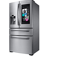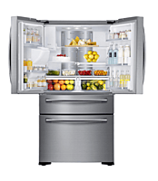 grade a Samsung RF22NPEDBSR is a 22 cu. ft. counter-depth 4-Door Flex French door refrigerator designed to provide a built-in look while maximizing storage flexibility. The innovative FlexZone™ drawer allows adjustable temperature settings for meats, beverages, deli items, or wine storage. This model features Twin Cooling Plus® technology to maintain optimal humidity levels and prevent odor transfer between compartments. It includes an external water and ice dispenser with Ice Master ice maker, LED interior lighting, adjustable spill-proof glass shelves, and gallon door bins for organized storage. The stainless steel finish offers a modern appearance and durability. Unit works properly. Minor dents and scratches may be present. ⸻