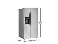 Grade A The LG LS27T3230S is a 27 cu. ft. Standard-Depth Side-by-Side Refrigerator, combining generous storage capacity with a sleek modern design. Features the Slim SpacePlus® Ice System, built into the door to maximize shelf space inside. Equipped with an external water and ice dispenser for filtered, fresh-tasting water and cubed or crushed ice. The Multi-Air Flow™ cooling system and Smart Cooling™ technology help maintain ideal humidity and temperature levels, keeping food fresher longer. Wi-Fi enabled and compatible with the LG ThinQ® app, allowing you to adjust settings, monitor performance, and receive alerts remotely. Interior includes adjustable tempered glass shelves, two humidity-controlled crispers, and ample freezer shelving for flexible organization. The PrintProof™ stainless steel finish resists fingerprints and smudges for an easy-to-clean exterior. Bright LED lighting illuminates every corner of the fridge and freezer. Energy Star® Certified for high efficiency and reduced operating costs. Capacity: 27 cu. ft. (17.5 refrigerator / 9.5 freezer) Dimensions: 35.88” W × 70.25” H × 33.5” D Electrical: 115V / 60Hz https://www.homedepot.com/p/LG-27-cu-ft-Side-by-Side-Standard-Depth-Slim-In-Door-Ice-and-Water-Dispenser-in-PrintProof-Stainless-Steel-Wi-Fi-enabled-LS27T3230S/332205878#see-more-details