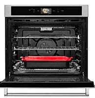 grade a The KitchenAid KOSE900HSS is a 30-inch built-in single electric wall oven with a 5.0 cu. ft. capacity, designed for reliable performance and modern cooking flexibility. It features Even-Heat™ True Convection, which uses a unique bow-tie design and convection fan to deliver consistent temperatures and even baking results on every rack. This model includes a built-in Air Fry mode, allowing you to achieve crispy, golden results without the need for additional countertop appliances. The oven is equipped with glass touch controls, providing a sleek appearance and intuitive operation. Additional features include a temperature probe for precise cooking, multiple convection modes, and a self-cleaning system for easy maintenance. The stainless steel finish offers a clean, professional look that integrates seamlessly into modern kitchen cabinetry.