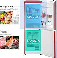 Grade. A The Galanz GLR74BRDR12 is a 7.4 cu. ft. retro-style top-freezer refrigerator combining nostalgic design with modern performance. Its glossy red finish and chrome-plated handles give a classic mid-century aesthetic perfect for kitchens, offices, or studio spaces. The refrigerator offers 5.0 cu. ft. of fresh food capacity and 2.4 cu. ft. of freezer space for compact yet efficient storage. Adjustable glass shelves, a crisper drawer, and full-width door bins allow convenient organization. The mechanical thermostat control provides simple, reliable temperature adjustment. Equipped with interior LED lighting for clear visibility and a separate freezer compartment for frozen items. Reversible door hinges allow left- or right-side opening for flexible installation. Operates quietly and efficiently with R600a refrigerant and low energy consumption. Perfect for apartments, dorms, or as a stylish secondary fridge. Unit is fully functional and cools perfectly; overall in great condition with no mechanical issues. https://www.amazon.com/Galanz-GLR74BRDR12-Refrigerator-Adjustable-Mechanical/dp/B08NVR2H4M?th=1
