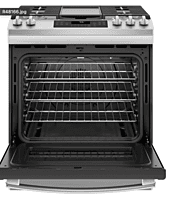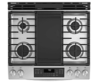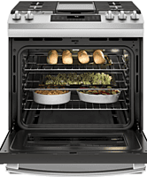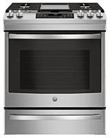 grade a The GE JGS760SELSS is a 30-inch slide-in gas range designed to deliver strong performance with a built-in, seamless kitchen appearance. This model features a gas cooktop with multiple burners, offering flexible heat levels for simmering, boiling, and high-heat cooking. The continuous grates allow smooth movement of cookware across the cooktop surface. The gas oven includes convection cooking, providing even heat circulation for consistent baking and roasting results. Front-mounted controls and a digital display offer intuitive operation and precise temperature control. The stainless steel finish delivers a clean, modern look that pairs well with other kitchen appliances. The unit has been tested and is fully functional. There may be minor cosmetic imperfections such as small dents or light scratches. These are cosmetic only and do not affect performance or operation.