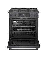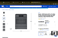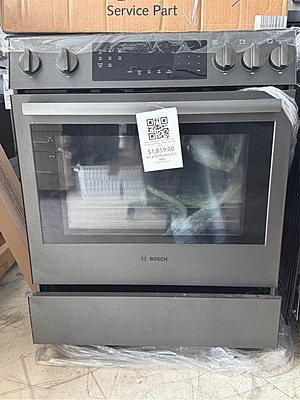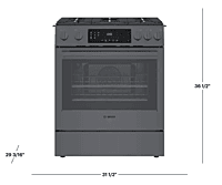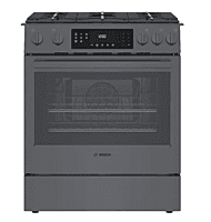 GRADE B The Bosch HGI8056UC is a 30-inch slide-in gas range from the Bosch 800 Series, designed for precise cooking performance and a built-in, seamless kitchen appearance. This model features a gas cooktop with high-performance burners, providing strong heat for boiling and searing, along with precise low-heat control for simmering. The continuous grates allow easy movement of cookware across the cooktop surface. The 4.8 cu. ft. gas oven includes true European convection, ensuring even heat distribution for consistent baking and roasting results. A self-cleaning oven system offers convenient maintenance with minimal effort. The range is finished in Black Stainless Steel, which resists fingerprints and provides a modern, premium look that matches other Bosch appliances. The unit has been tested and is fully functional. There may be minor cosmetic imperfections such as small dents or light scratches. These are cosmetic only and do not affect performance or operation.