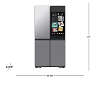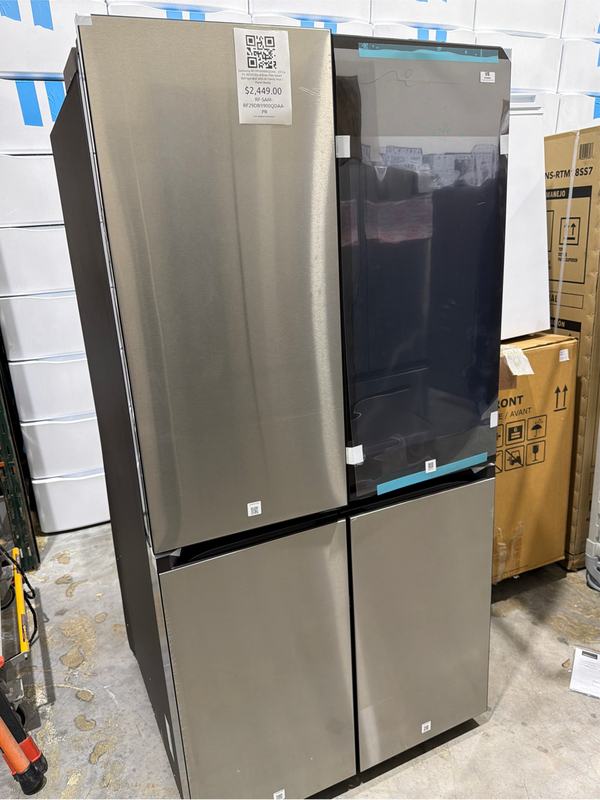 grade a Samsung RF29DB9900QDAA is a premium 29 cu. ft. BESPOKE 4-Door Flex™ smart refrigerator designed with customizable panel-ready doors for a modern, built-in appearance. This model features the advanced AI Family Hub™ touchscreen, allowing smart home connectivity, internal cameras, grocery management, and voice assistant integration. The FlexZone™ drawer offers adjustable temperature settings for meats, beverages, deli items, or wine. It includes dual ice makers with Ice Bites™, an external water and ice dispenser, and precise cooling with Twin Cooling Plus® technology to maintain optimal humidity and prevent odor transfer. Additional features include LED lighting, adjustable spill-proof shelves, large gallon door bins, Wi-Fi connectivity, and SmartThings compatibility. Unit operates properly. Minor dents and scratches may be present.